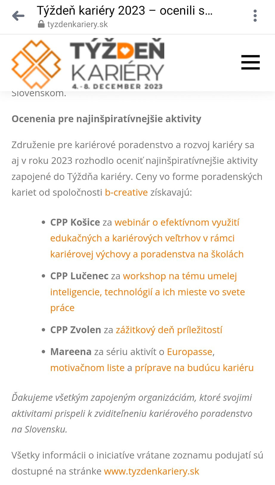 DOSTALI SME OCENENIE ZA NAJINŠPIRATÍVNEJŠIE AKTIVITY V RÁMCI TÝŽDŇA KARIÉRY, KTORÉ OCENILO ZDRUŽENIE PRE KARIÉROVÉ PORADENSTVO A ROZVOJ KARIÉRY PRE ROK 2023